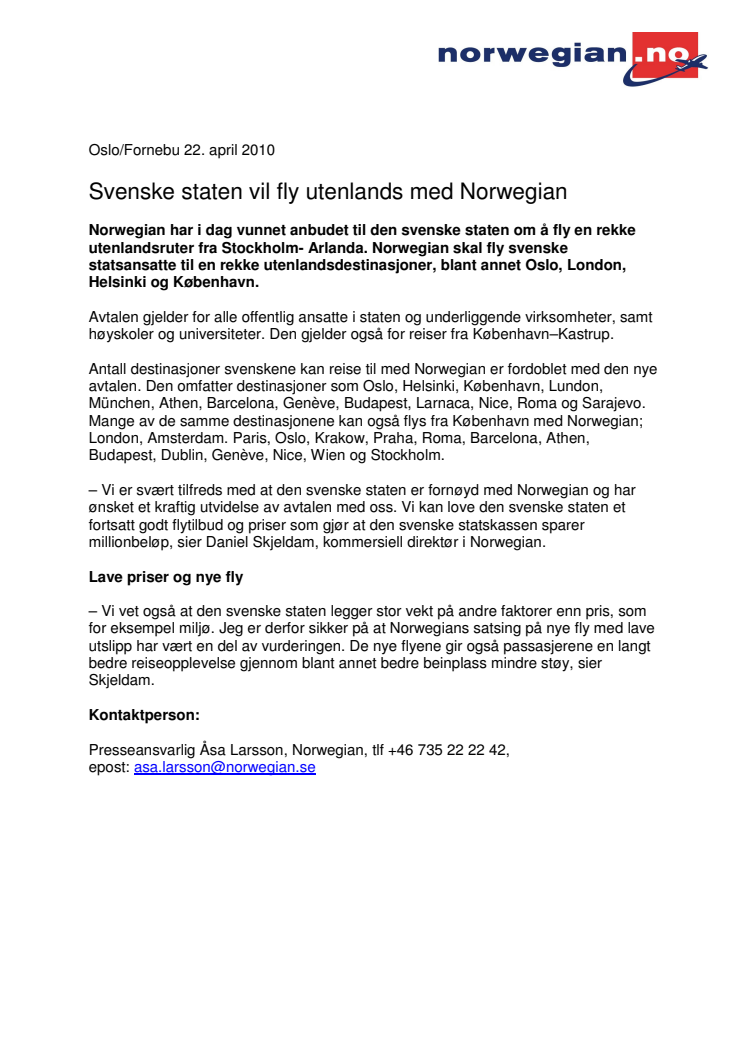 Norwegian har i dag vunnet anbudet til den svenske staten om å fly en rekke utenlandsruter fra Stockholm- Arlanda. Norwegian skal fly svenske statsansatte til en rekke utenlandsdestinasjoner, blant annet Oslo, London, Helsinki og København.