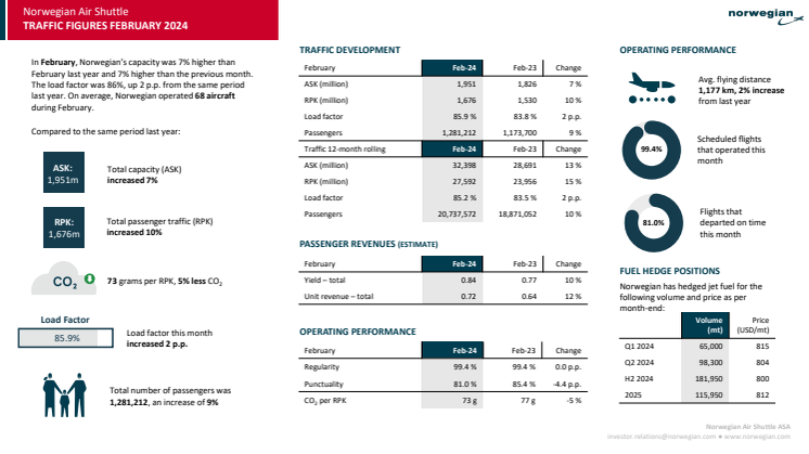 Norwegian hadde 1 281 212 passasjerer i februar. Kapasiteten (ASK) var 1 951 millioner setekilometer, som er opp syv prosent fra året før, mens faktisk passasjertrafikk (RPK) var 1 676 millioner setekilometer. I februar hadde Norwegian i gjennomsnitt 68 fly i drift, og 99,4 prosent av oppsatte flyvninger ble gjennomført. Punktligheten, målt som andel avganger innen 15 minutter etter ordinær tid, var på 81,0.