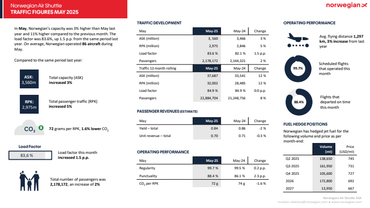 Kapasiteten (ASK) i Norwegian var 3 560 millioner setekilometer i mai, opp 3 prosent fra fjoråret. Faktisk passasjertrafikk (RPK) var på 2 975 millioner setekilometer, en økning på 5 prosent. Fyllingsgraden var 83,6 prosent, opp 1,5 prosentpoeng. Norwegian hadde i gjennomsnitt 86 fly i drift i mai.