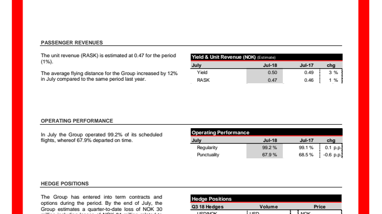 Totalt 3 796 283 passasjerer reiste med Norwegian i juli, 437 718 (13 prosent) flere enn samme måned i fjor. Den totale trafikkveksten (RPK) økte med 33 prosent og kapasitetsveksten (ASK) med 35 prosent. Fyllingsgraden i juli var på 93 prosent.