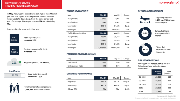 Kapasiteten (ASK) var 3 466 millioner setekilometer, som er opp 19 prosent fra samme periode i fjor. Faktisk passasjertrafikk (RPK) var 2 843 setekilometer, opp 16 prosent fra mai 2023. I mai ble 99,5 prosent av oppsatte flyvninger gjennomført. Punktligheten, målt i andel avganger innen 15 minutter etter ordinær tid, var på 86,1 prosent, opp 1,2 prosentpoeng fra mai i fjor.